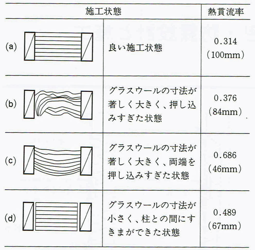 これらによると、グラスウールは施工状態によっては断熱性能が理論値の半分以下になりうるので、「施工に左右されるグラスウール断熱材はよくない」、あるいは「施工が大事」といった結論が導かれます。